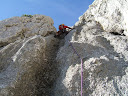Noch einmal das milde Spätherbstwetter ausgenützt… Eine brandneue Tour durch eine namenlose Wand zwischen Berchtesgadener Hochthron und Gamsalmkopf war unser Ziel. Nach 1,5 Stunden Zustieg war auch der Einstieg schnell gefunden. Die perfekte Absicherung und der rauhe, wasserzerfressene Fels ließen keine Wünsche offen – da macht es dann gar nichts daß die Tour schon unter dem Gipfel endet. Diesen erreichten wir trotzdem indem wir über den Grubenpfad weiter aufgestiegen sind und im Anschluß daran durch das Mittagsloch wieder hinunter zum Scheibenkaser. Meiner Meinung nach sehr lohnende Runde!
